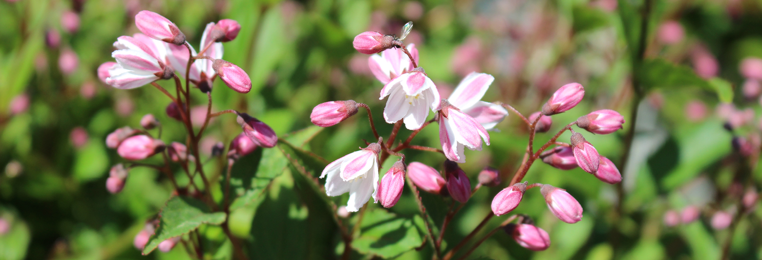 The rich mahogany color of the shiny, short-stemmed leaves turns darker and more lustrous in the winter, ideal in a frosted or snowy landscape. Pretty bright blue flowers punctuate this creeper, mostly in the spring. - Ceratostigma plumbaginoides ‘Leadwort’
